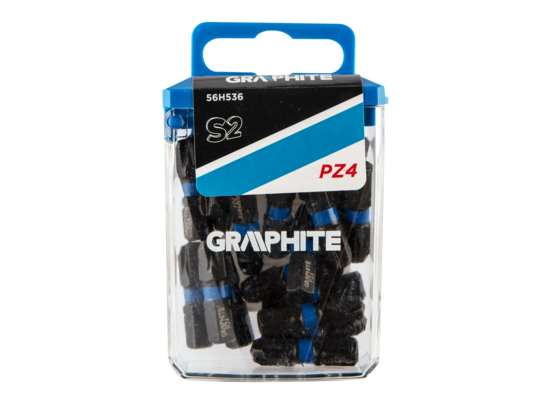 Bity udarowe GRAPHITE (nr ref. 56H536) typ PZ4, o długości całkowitej 25 mm, to wytrzymałe bity przeznaczone do cięższych prac z zastosowaniem wysokich momentów obrotowych przy użyciu wkrętarek bądź zakrętarek udarowych. Wykonane z wysokogatunkowej stali S2, która cechuje się zwiększoną elastycznością i wytrzymałością na uszkodzenia mechaniczne. Obracająca się pod wpływem wysokiego momentu obrotowego strefa skrętna zmniejsza przenoszenie siły, przez co bit jest bardziej odporny na złamanie, a jego żywotność jest wydłużona kilkukrotnie. Końcówka robocza grota gwarantuje idealne dopasowanie. Wygodne, plastikowe pudełko pozwala łatwo przechowywać końcówki. Marka GRAPHITE oferuje szeroki asortyment elektronarzędzi spełniających wymagania profesjonalistów.
