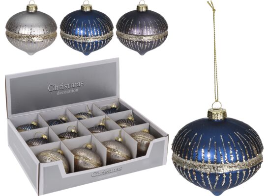 - >Bombka w kształcie cebulki zdobiona złotym brokatem 8 cm mix