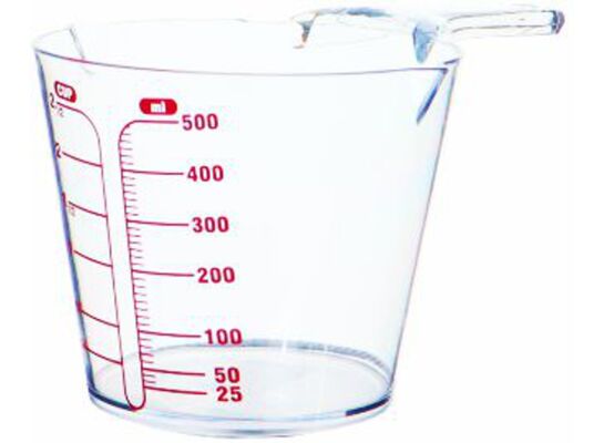 Naczynie pomiarowe miarka - kubek o pojemności 500 ml wyposażone jest w wygodny uchwyt, służy do odmierzania produktów.