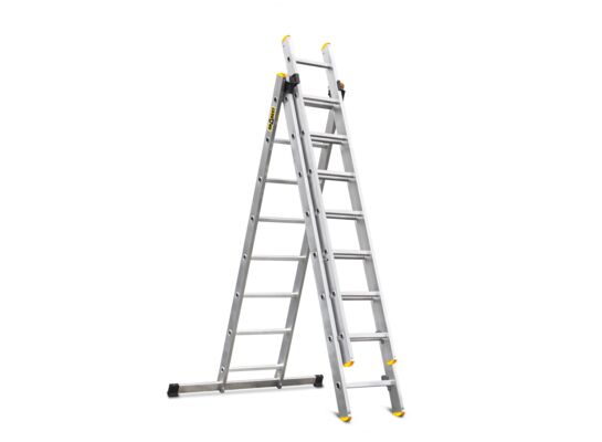 Drabina aluminiowa przemysłowa. Profesjonalna drabina trzyelementowa PRO to doskonałe narzędzie pracy dla specjalistów, poszukujących najwyższych standardów bezpieczeństwa oraz solidności. Stabilizator montowany wyłącznie za pomocą śrub. Szczeble o profilu 28x28 mm posiadają ryflowanie, przytwierdzone do profilu systemem mocnego tłoczenia. Zaciskane stopki antypoślizgowe oraz prowadnice ułatwiają ustawienie drabiny w pozycji wolnostojącej. Solidne zaczepy, zwora malowana, blokady automatyczne. Możliwość korzystania z drabiny na schodach. Nośność max. 150 kg.