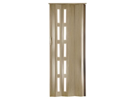 drzwi harmonijkowe z wysokiej jakości materiału PVC, panele pełne, komorowe, półmatowe o strukturze drewna, połączone elastycznymi, mocnymi zawiasami, matowe przepuszczające światło szybki, możliwość rozbudowy o panele pełne lub z szybkami, możliwość skracania drzwi do wysokości szybek (8 cm), posiadają wygodny uchwyt do zamykania, zamek zatrzaskowy z dwoma magnesami, w komplecie pełny zestaw montażowy wraz z instrukcją, kierunek otwierania uniwersalny