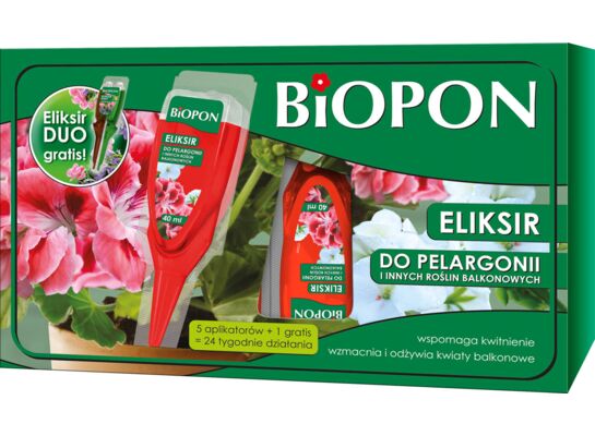 Innowacyjny preparat przeznaczony do pielęgnacji pelargonii i innych roślin balkonowych. Specjalnie dobrany skład eliksiru dba o piękny i zdrowy wygląd kwiatów oraz liści zasilanych roślin . Gotowa do użycia, porcjowana postać preparatu oraz samodozujący aplikator gwarantują łatwość i wygodę stosowania. Działanie eliksiru utrzymuje się aż do 4 tygodni.