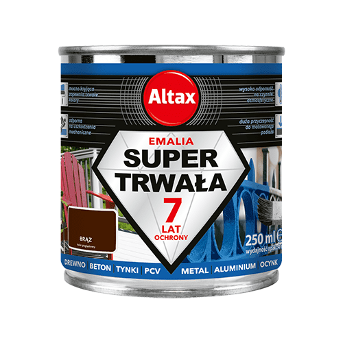 Emalia super trwała 250 ml brąz Altax zapewnia szerokie pole działania i 7-letnią trwałość koloru. Po nałożeniu na powierzchni tworzą się powłoki o wysokiej odporności na czynniki atmosferyczne i uszkodzenia mechaniczne oraz o bardzo dobrej przyczepności do podłoża. Dzięki temu pomalujesz powierzchnie bez nadmiernego chlapania, przywrócisz im intensywność koloru i nadasz połyskliwe wykończenie. Emalia jest przeznaczona do malowania drewna, metalu, betonu, tynku, ocynku wysezonowanego i PCV. Jej wydajność wynosi 16 m² / l, a całkowity czas schnięcia to 18 h.