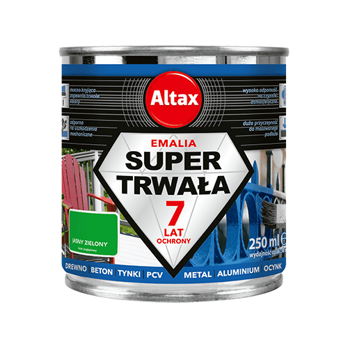 Emalia super trwała 250 ml jasny zielony Altax zapewnia szerokie pole działania i 7-letnią trwałość koloru. Po nałożeniu na powierzchni tworzą się powłoki o wysokiej odporności na czynniki atmosferyczne i uszkodzenia mechaniczne oraz o bardzo dobrej przyczepności do podłoża. Dzięki temu pomalujesz powierzchnie bez nadmiernego chlapania, przywrócisz im intensywność koloru i nadasz połyskliwe wykończenie. Emalia jest przeznaczona do malowania drewna, metalu, betonu, tynku, ocynku wysezonowanego i PCV. Jej wydajność wynosi 16 m² / l, a całkowity czas schnięcia to 18 h.