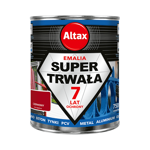 Emalia super trwała 750 ml czerwony Altax o wykończeniu z półpołyskiem zapewnia 7-letnią trwałość koloru, bardzo dobre krycie i świetną odporność na czynniki atmosferyczne, takie jak woda, śnieg oraz promieniowanie UV. Dzięki temu pomalowana nią powierzchnia zachowa swój estetyczny wygląd na długi czas. Dodatkową zaletą produktu jest bardzo dobra przyczepność do podłoża, dzięki czemu masz możliwość odświeżenia koloru bez nadmiernego chlapania. Emalia jest przeznaczona do malowania wszystkich elementów wykonanych z drewna, metalu, ocynku wysezonowanego, betonu i PCV.