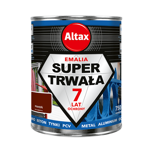 Emalia super trwała 750 ml mahoń Altax o wykończeniu z półpołyskiem zapewnia 7-letnią trwałość koloru, bardzo dobre krycie i świetną odporność na czynniki atmosferyczne, takie jak woda, śnieg oraz promieniowanie UV. Dzięki temu pomalowana nią powierzchnia zachowa swój estetyczny wygląd na długi czas. Dodatkową zaletą produktu jest bardzo dobra przyczepność do podłoża, dzięki czemu masz możliwość odświeżenia koloru bez nadmiernego chlapania. Emalia jest przeznaczona do malowania wszystkich elementów wykonanych z drewna, metalu, ocynku wysezonowanego, betonu i PCV.