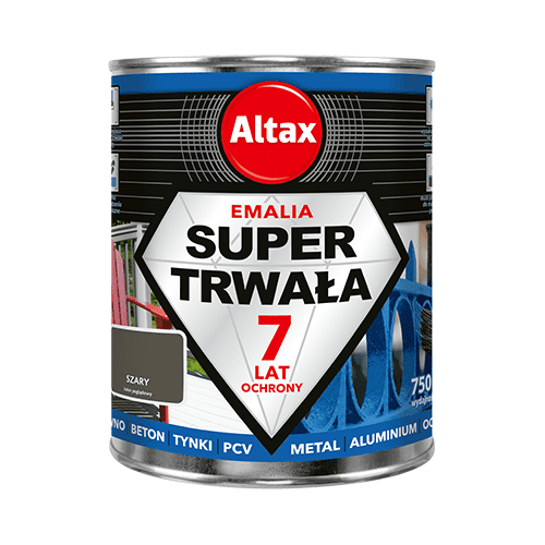 Emalia super trwała 750 ml szara Altax o wykończeniu z półpołyskiem zapewnia 7-letnią trwałość koloru, bardzo dobre krycie i świetną odporność na czynniki atmosferyczne, takie jak woda, śnieg oraz promieniowanie UV. Dzięki temu pomalowana nią powierzchnia zachowa swój estetyczny wygląd na długi czas. Dodatkową zaletą produktu jest bardzo dobra przyczepność do podłoża, dzięki czemu masz możliwość odświeżenia koloru bez nadmiernego chlapania. Emalia jest przeznaczona do malowania wszystkich elementów wykonanych z drewna, metalu, ocynku wysezonowanego, betonu i PCV.