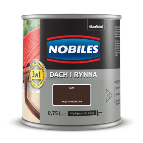 Farba akrylowa Dach i Rynna Brąz Mahoniowy RAL 8016 0,75 l NOBILES o wydajności 7 m² / l służy do ochronno-dekoracyjnego malowania powierzchni ocynkowanych, takich jak blachodachówki, rynny, rury, konstrukcje metalowe czy siatki ogrodzeniowe. Dzięki nowoczesnej formule produkt zapewnia długotrwałe zabezpieczenie antykorozyjne malowanej powierzchni. Wysoka odporność na czynniki atmosferyczne i mechaniczne sprawia natomiast, że powierzchnia świetnie będzie się prezentować przez długi czas. Produkt bazuje na recepturze 3 w 1, która łączy zalety gruntu, podkładu i emalii.