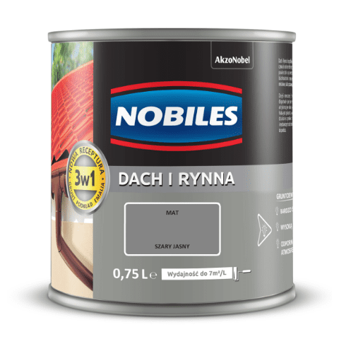 Farba akrylowa Dach i Rynna Szary Jasny 0,75 l NOBILES o wydajności 7 m² / l służy do ochronno-dekoracyjnego malowania powierzchni ocynkowanych, takich jak blachodachówki, rynny, rury, konstrukcje metalowe czy siatki ogrodzeniowe. Dzięki nowoczesnej formule produkt zapewnia długotrwałe zabezpieczenie antykorozyjne malowanej powierzchni. Wysoka odporność na czynniki atmosferyczne i mechaniczne sprawia natomiast, że powierzchnia świetnie będzie się prezentować przez długi czas. Produkt bazuje na recepturze 3 w 1, która łączy zalety gruntu, podkładu i emalii.