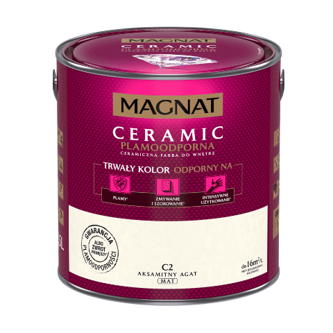 Farba ceramiczna MAGNAT Ceramic aksamitny agat C2 2,5 l bazuje na ceramicznych komponentach, żywicach i pigmentach. Jej formuła sprawia, że wykończenie jest matowe, a kolor jest nie tylko trwały, ale także odporny na wielokrotne zmywanie, szorowanie, plamy czy intensywne użytkowanie. Farba nadaje się do malowania ścian wewnątrz budynków, dlatego świetnie sprawdzi się w domu, w którym mieszkają małe dzieci, a także w szkołach, przedszkolach i żłobkach, przychodniach czy restauracjach.