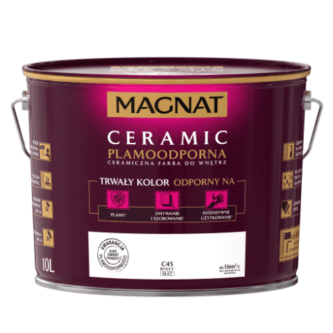 Farba ceramiczna biała C45 10 l MAGNAT bazuje na ceramicznych komponentach, żywicach i pigmentach. Jej formuła sprawia, że powierzchnia ma piękne, matowe wykończenie, a kolor jest nie tylko trwały, ale także odporny na wielokrotne zmywanie, szorowanie, plamy czy intensywne użytkowanie. Farba nadaje się do malowania ścian wewnątrz budynków, dlatego świetnie sprawdzi się w domu, w którym mieszkają małe dzieci, a także w szkołach, przedszkolach i żłobkach, przychodniach czy restauracjach.