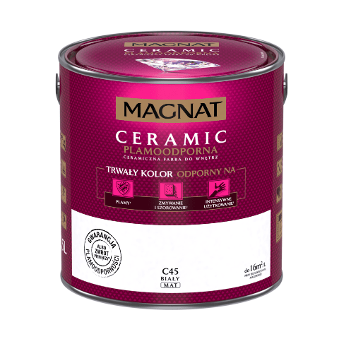 Farba ceramiczna MAGNAT Ceramic biały C45 2,5 l bazuje na ceramicznych komponentach, żywicach i pigmentach. Jej formuła sprawia, że wykończenie jest matowe, a kolor jest nie tylko trwały, ale także odporny na wielokrotne zmywanie, szorowanie, plamy czy intensywne użytkowanie. Farba nadaje się do malowania ścian wewnątrz budynków, dlatego świetnie sprawdzi się w domu, w którym mieszkają małe dzieci, a także w szkołach, przedszkolach i żłobkach, przychodniach czy restauracjach.