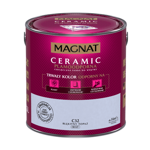 Farba ceramiczna MAGNAT Ceramic błękitny topaz C32 2,5 l bazuje na ceramicznych komponentach, żywicach i pigmentach. Jej formuła sprawia, że wykończenie jest matowe, a kolor jest nie tylko trwały, ale także odporny na wielokrotne zmywanie, szorowanie, plamy czy intensywne użytkowanie. Farba nadaje się do malowania ścian wewnątrz budynków, dlatego świetnie sprawdzi się w domu, w którym mieszkają małe dzieci, a także w szkołach, przedszkolach i żłobkach, przychodniach czy restauracjach.