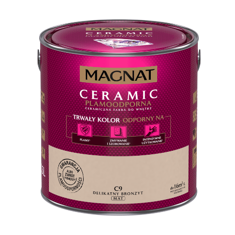 Farba ceramiczna MAGNAT Ceramic delikatny bronzyt C9 2,5 l bazuje na ceramicznych komponentach, żywicach i pigmentach. Jej formuła sprawia, że wykończenie jest matowe, a kolor jest nie tylko trwały, ale także odporny na wielokrotne zmywanie, szorowanie, plamy czy intensywne użytkowanie. Farba nadaje się do malowania ścian wewnątrz budynków, dlatego świetnie sprawdzi się w domu, w którym mieszkają małe dzieci, a także w szkołach, przedszkolach i żłobkach, przychodniach czy restauracjach.