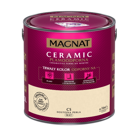 Farba ceramiczna MAGNAT Ceramic dostojna perła C5 2,5 l bazuje na ceramicznych komponentach, żywicach i pigmentach. Jej formuła sprawia, że wykończenie jest matowe, a kolor jest nie tylko trwały, ale także odporny na wielokrotne zmywanie, szorowanie, plamy czy intensywne użytkowanie. Farba nadaje się do malowania ścian wewnątrz budynków, dlatego świetnie sprawdzi się w domu, w którym mieszkają małe dzieci, a także w szkołach, przedszkolach i żłobkach, przychodniach czy restauracjach.