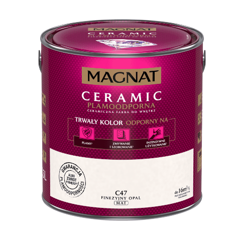 Farba ceramiczna MAGNAT Ceramic finezyjny opal C47 2,5 l bazuje na ceramicznych komponentach, żywicach i pigmentach. Jej formuła sprawia, że wykończenie jest matowe, a kolor jest nie tylko trwały, ale także odporny na wielokrotne zmywanie, szorowanie, plamy czy intensywne użytkowanie. Farba nadaje się do malowania ścian wewnątrz budynków, dlatego świetnie sprawdzi się w domu, w którym mieszkają małe dzieci, a także w szkołach, przedszkolach i żłobkach, przychodniach czy restauracjach.