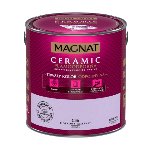 Farba ceramiczna MAGNAT Ceramic fiołkowy ametyst C36 2,5 l bazuje na ceramicznych komponentach, żywicach i pigmentach. Jej formuła sprawia, że wykończenie jest matowe, a kolor jest nie tylko trwały, ale także odporny na wielokrotne zmywanie, szorowanie, plamy czy intensywne użytkowanie. Farba nadaje się do malowania ścian wewnątrz budynków, dlatego świetnie sprawdzi się w domu, w którym mieszkają małe dzieci, a także w szkołach, przedszkolach i żłobkach, przychodniach czy restauracjach.
