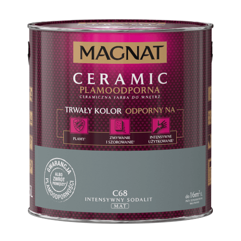 Farba ceramiczna MAGNAT Ceramic intensywny sodalit C68 2,5 l bazuje na ceramicznych komponentach, żywicach i pigmentach. Jej formuła sprawia, że wykończenie jest matowe, a kolor jest nie tylko trwały, ale także odporny na wielokrotne zmywanie, szorowanie, plamy czy intensywne użytkowanie. Farba nadaje się do malowania ścian wewnątrz budynków, dlatego świetnie sprawdzi się w domu, w którym mieszkają małe dzieci, a także w szkołach, przedszkolach i żłobkach, przychodniach czy restauracjach.