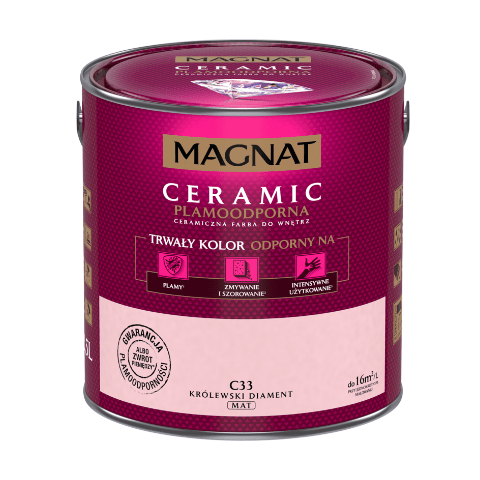 Farba ceramiczna MAGNAT Ceramic królewski diament C33 2,5 l bazuje na ceramicznych komponentach, żywicach i pigmentach. Jej formuła sprawia, że wykończenie jest matowe, a kolor jest nie tylko trwały, ale także odporny na wielokrotne zmywanie, szorowanie, plamy czy intensywne użytkowanie. Farba nadaje się do malowania ścian wewnątrz budynków, dlatego świetnie sprawdzi się w domu, w którym mieszkają małe dzieci, a także w szkołach, przedszkolach i żłobkach, przychodniach czy restauracjach.