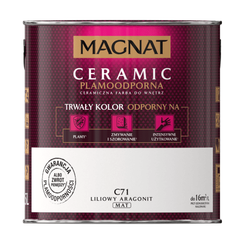 Farba ceramiczna MAGNAT Ceramic liliowy aragonit C71 2,5 l bazuje na ceramicznych komponentach, żywicach i pigmentach. Jej formuła sprawia, że wykończenie jest matowe, a kolor jest nie tylko trwały, ale także odporny na wielokrotne zmywanie, szorowanie, plamy czy intensywne użytkowanie. Farba nadaje się do malowania ścian wewnątrz budynków, dlatego świetnie sprawdzi się w domu, w którym mieszkają małe dzieci, a także w szkołach, przedszkolach i żłobkach, przychodniach czy restauracjach.