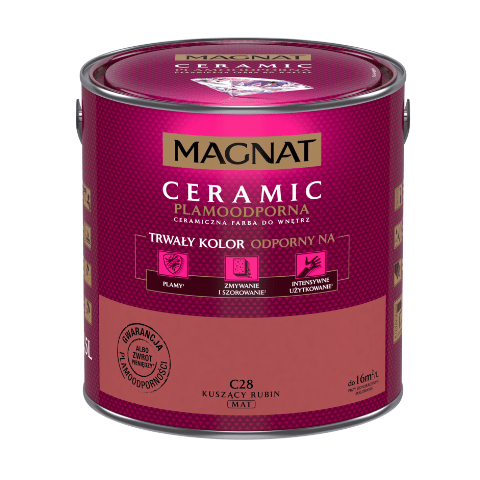 Farba ceramiczna MAGNAT Ceramic kuszący rubin C28 2,5 l bazuje na ceramicznych komponentach, żywicach i pigmentach. Jej formuła sprawia, że wykończenie jest matowe, a kolor jest nie tylko trwały, ale także odporny na wielokrotne zmywanie, szorowanie, plamy czy intensywne użytkowanie. Farba nadaje się do malowania ścian wewnątrz budynków, dlatego świetnie sprawdzi się w domu, w którym mieszkają małe dzieci, a także w szkołach, przedszkolach i żłobkach, przychodniach czy restauracjach.