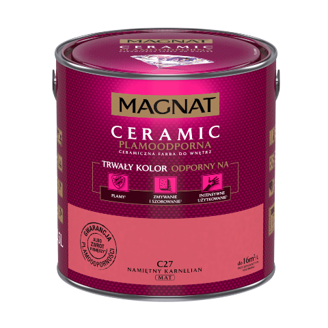 Farba ceramiczna MAGNAT Ceramic namiętny karneol C27 2,5 l bazuje na ceramicznych komponentach, żywicach i pigmentach. Jej formuła sprawia, że wykończenie jest matowe, a kolor jest nie tylko trwały, ale także odporny na wielokrotne zmywanie, szorowanie, plamy czy intensywne użytkowanie. Farba nadaje się do malowania ścian wewnątrz budynków, dlatego świetnie sprawdzi się w domu, w którym mieszkają małe dzieci, a także w szkołach, przedszkolach i żłobkach, przychodniach czy restauracjach.