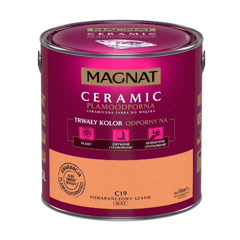 Farba ceramiczna MAGNAT Ceramic pomarańczowy szafir C19 2,5 l bazuje na ceramicznych komponentach, żywicach i pigmentach. Jej formuła sprawia, że wykończenie jest matowe, a kolor jest nie tylko trwały, ale także odporny na wielokrotne zmywanie, szorowanie, plamy czy intensywne użytkowanie. Farba nadaje się do malowania ścian wewnątrz budynków, dlatego świetnie sprawdzi się w domu, w którym mieszkają małe dzieci, a także w szkołach, przedszkolach i żłobkach, przychodniach czy restauracjach.