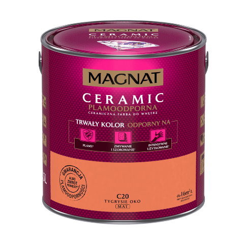 Farba ceramiczna MAGNAT Ceramic tygrysie oko C20 2,5 l bazuje na ceramicznych komponentach, żywicach i pigmentach. Jej formuła sprawia, że wykończenie jest matowe, a kolor jest nie tylko trwały, ale także odporny na wielokrotne zmywanie, szorowanie, plamy czy intensywne użytkowanie. Farba nadaje się do malowania ścian wewnątrz budynków, dlatego świetnie sprawdzi się w domu, w którym mieszkają małe dzieci, a także w szkołach, przedszkolach i żłobkach, przychodniach czy restauracjach.
