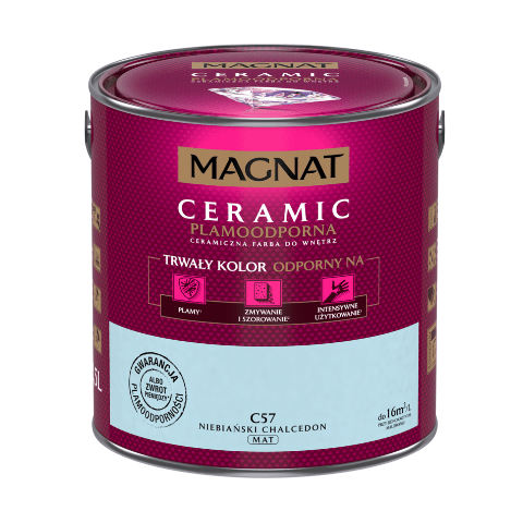 Farba ceramiczna MAGNAT Ceramic niebiański chalcedon C57 2,5 l bazuje na ceramicznych komponentach, żywicach i pigmentach. Jej formuła sprawia, że wykończenie jest matowe, a kolor jest nie tylko trwały, ale także odporny na wielokrotne zmywanie, szorowanie, plamy czy intensywne użytkowanie. Farba nadaje się do malowania ścian wewnątrz budynków, dlatego świetnie sprawdzi się w domu, w którym mieszkają małe dzieci, a także w szkołach, przedszkolach i żłobkach, przychodniach czy restauracjach.