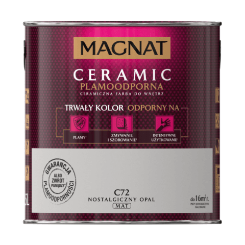 Farba ceramiczna MAGNAT Ceramic nostalgiczny opal C72 2,5 l bazuje na ceramicznych komponentach, żywicach i pigmentach. Jej formuła sprawia, że wykończenie jest matowe, a kolor jest nie tylko trwały, ale także odporny na wielokrotne zmywanie, szorowanie, plamy czy intensywne użytkowanie. Farba nadaje się do malowania ścian wewnątrz budynków, dlatego świetnie sprawdzi się w domu, w którym mieszkają małe dzieci, a także w szkołach, przedszkolach i żłobkach, przychodniach czy restauracjach.
