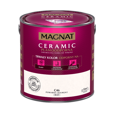 Farba ceramiczna MAGNAT Ceramic powabny diament C46 2,5 l bazuje na ceramicznych komponentach, żywicach i pigmentach. Jej formuła sprawia, że wykończenie jest matowe, a kolor jest nie tylko trwały, ale także odporny na wielokrotne zmywanie, szorowanie, plamy czy intensywne użytkowanie. Farba nadaje się do malowania ścian wewnątrz budynków, dlatego świetnie sprawdzi się w domu, w którym mieszkają małe dzieci, a także w szkołach, przedszkolach i żłobkach, przychodniach czy restauracjach.