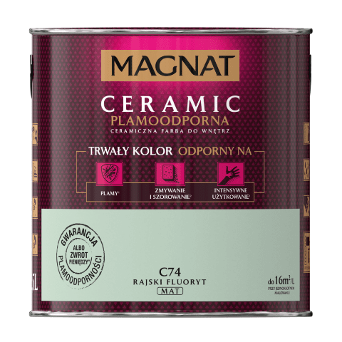 Farba ceramiczna MAGNAT Ceramic rajski fluoryt C74 2,5 l bazuje na ceramicznych komponentach, żywicach i pigmentach. Jej formuła sprawia, że wykończenie jest matowe, a kolor jest nie tylko trwały, ale także odporny na wielokrotne zmywanie, szorowanie, plamy czy intensywne użytkowanie. Farba nadaje się do malowania ścian wewnątrz budynków, dlatego świetnie sprawdzi się w domu, w którym mieszkają małe dzieci, a także w szkołach, przedszkolach i żłobkach, przychodniach czy restauracjach.
