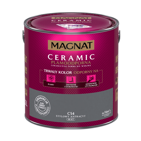Farba ceramiczna MAGNAT Ceramic stylowy antracyt C54 2,5 l bazuje na ceramicznych komponentach, żywicach i pigmentach. Jej formuła sprawia, że wykończenie jest matowe, a kolor jest nie tylko trwały, ale także odporny na wielokrotne zmywanie, szorowanie, plamy czy intensywne użytkowanie. Farba nadaje się do malowania ścian wewnątrz budynków, dlatego świetnie sprawdzi się w domu, w którym mieszkają małe dzieci, a także w szkołach, przedszkolach i żłobkach, przychodniach czy restauracjach.