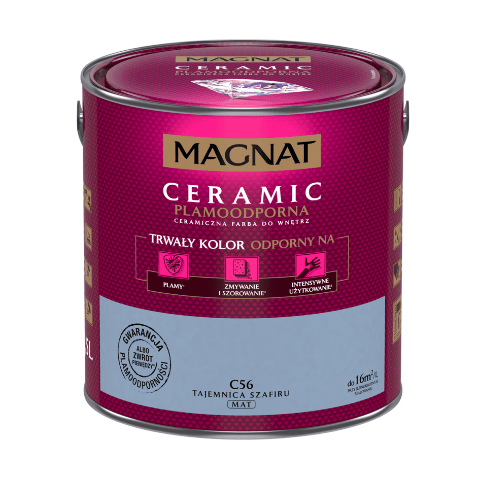 Farba ceramiczna MAGNAT Ceramic tajemnica szafiru C56 2,5 l bazuje na ceramicznych komponentach, żywicach i pigmentach. Jej formuła sprawia, że wykończenie jest matowe, a kolor jest nie tylko trwały, ale także odporny na wielokrotne zmywanie, szorowanie, plamy czy intensywne użytkowanie. Farba nadaje się do malowania ścian wewnątrz budynków, dlatego świetnie sprawdzi się w domu, w którym mieszkają małe dzieci, a także w szkołach, przedszkolach i żłobkach, przychodniach czy restauracjach.