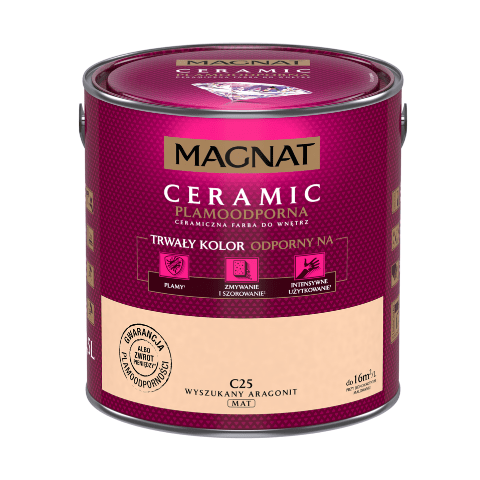 Farba ceramiczna MAGNAT Ceramic wyszukany aragonit C25 2,5 l bazuje na ceramicznych komponentach, żywicach i pigmentach. Jej formuła sprawia, że wykończenie jest matowe, a kolor jest nie tylko trwały, ale także odporny na wielokrotne zmywanie, szorowanie, plamy czy intensywne użytkowanie. Farba nadaje się do malowania ścian wewnątrz budynków, dlatego świetnie sprawdzi się w domu, w którym mieszkają małe dzieci, a także w szkołach, przedszkolach i żłobkach, przychodniach czy restauracjach.