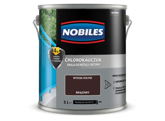 Farba chlorokauczukowa Chlorokauczuk Brązowy 5 l NOBILES w połysku służy do ochronno-dekoracyjnego malowania powierzchni stalowych, żeliwnych i betonowych na zewnątrz. Po nałożeniu tworzy ona na malowanej powierzchni powłokę, która jest odporna na działanie czynników atmosferycznych i zarysowania. Dzięki temu, że produkt zapewnia 4 razy większą odporność na uderzenia, powierzchnie zachowują estetyczny wygląd na dłużej. Wydajność farby wynosi 8 m² / l.