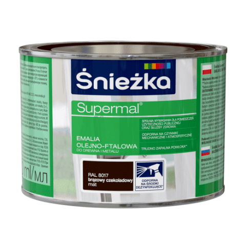 Farba emaliowa olejno-ftalowa Supermal matowy brąz czekoladowy 0,8 l Śnieżka jest przeznaczona do dekoracyjno-ochronnego malowania zarówno wewnątrz, jak i na zewnątrz pomieszczeń. Za jej pomocą odświeżysz wygląd powierzchni drewnianych, materiałów drewnopochodnych, tynków, a także elementów stalowych i żeliwnych. Produkt tworzy trudno zapalną powłokę, która podczas pożaru może zapobiec rozprzestrzenianiu się ognia. Ze względu na wysoką odporność na czynniki mechaniczne oraz środki dezynfekujące produkt sprawdzi się nie tylko w pomieszczeniach mieszkalnych, ale także szpitalach, przychodniach, szkołach i przedszkolach.