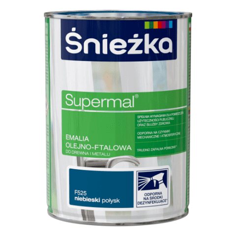 Farba emaliowa olejno-ftalowa Supermal niebieska 0,8 l Śnieżka jest przeznaczona do dekoracyjno-ochronnego malowania zarówno wewnątrz, jak i na zewnątrz pomieszczeń. Za jej pomocą odświeżysz wygląd powierzchni drewnianych, materiałów drewnopochodnych, tynków, a także elementów stalowych i żeliwnych. Produkt tworzy trudno zapalną powłokę, która podczas pożaru może zapobiec rozprzestrzenianiu się ognia. Ze względu na wysoką odporność na czynniki mechaniczne oraz środki dezynfekujące produkt sprawdzi się nie tylko w pomieszczeniach mieszkalnych, ale także szpitalach, przychodniach, szkołach i przedszkolach.