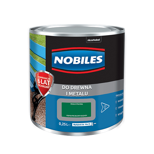Farba ftalowa do drewna i metalu Ftalonal Zielony Soczysty 0,25 l NOBILES służy do malowania powierzchni stalowych, żeliwnych, drewnianych, betonowych oraz tynków cementowo-wapiennych pokrytych uprzednio farbami podkładowymi lub antykorozyjnymi. Po nałożeniu na powierzchni tworzy się powłoka o bardzo dobrej przyczepności oraz odporności na czynniki atmosferyczne i produkty dezynfekujące. Dzięki temu podłoże jest łatwe w utrzymaniu w czystości i na długo zachowa swój estetyczny wygląd oraz intensywność koloru w półpołysku.