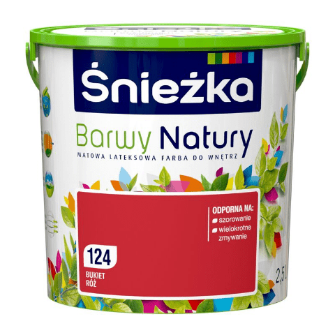 Farba lateksowa Barwy Natury bukiet róż 124 2,5 l Śnieżka jest przeznaczona do dekoracyjno-ochronnego malowania ścian i sufitów z zapraw cementowych, cementowo-wapiennych, gipsowych, cegły, płyt gipsowo-kartonowych, powierzchni drewnianych i drewnopochodnych, a także tapet z włókna szklanego użytkowanych wewnątrz pomieszczeń. Produkt zapewnia matowe wykończenie, wysoki poziom krycia i jest niezwykle łatwy w czyszczeniu dzięki lateksowej formule.