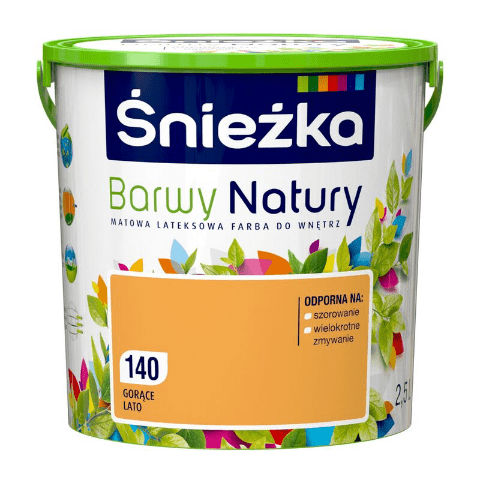 Farba lateksowa Barwy Natury gorące lato 140 2,5 l Śnieżka jest przeznaczona do dekoracyjno-ochronnego malowania ścian i sufitów z zapraw cementowych, cementowo-wapiennych, gipsowych, cegły, płyt gipsowo-kartonowych, powierzchni drewnianych i drewnopochodnych, a także tapet z włókna szklanego użytkowanych wewnątrz pomieszczeń. Produkt zapewnia matowe wykończenie, wysoki poziom krycia i jest niezwykle łatwy w czyszczeniu dzięki lateksowej formule.