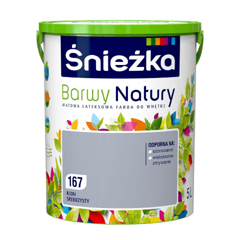 Farba lateksowa Barwy Natury klon srebrzysty 167 5 l Śnieżka zapewnia bardzo dobry poziom krycia, dzięki czemu wystarczy nałożyć tylko dwie warstwy emulsji, aby uzyskać pożądany efekt i szlachetne matowe wykończenie. Farba jest przeznaczona do dekoracyjno-ochronnego malowania ścian i sufitów z zapraw cementowych, cementowo-wapiennych, gipsowych, cegły, płyt gipsowo-kartonowych, powierzchni drewnianych i drewnopochodnych, a także tapet z włókna szklanego użytkowanych wewnątrz pomieszczeń.
