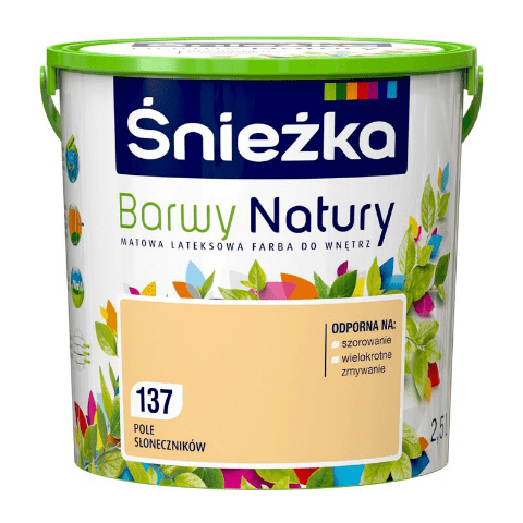 Farba lateksowa Barwy Natury pole słoneczników 137 7 2,5 l Śnieżka jest przeznaczona do dekoracyjno-ochronnego malowania ścian i sufitów z zapraw cementowych, cementowo-wapiennych, gipsowych, cegły, płyt gipsowo-kartonowych, powierzchni drewnianych i drewnopochodnych, a także tapet z włókna szklanego użytkowanych wewnątrz pomieszczeń. Produkt zapewnia matowe wykończenie, wysoki poziom krycia i jest niezwykle łatwy w czyszczeniu dzięki lateksowej formule.