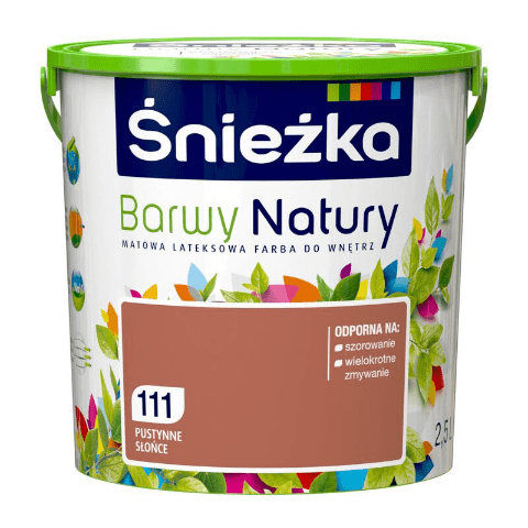 Farba lateksowa Barwy Natury pustynne słońce 111 2,5 l Śnieżka jest przeznaczona do dekoracyjno-ochronnego malowania ścian i sufitów z zapraw cementowych, cementowo-wapiennych, gipsowych, cegły, płyt gipsowo-kartonowych, powierzchni drewnianych i drewnopochodnych, a także tapet z włókna szklanego użytkowanych wewnątrz pomieszczeń. Produkt zapewnia matowe wykończenie, wysoki poziom krycia i jest niezwykle łatwy w czyszczeniu dzięki lateksowej formule.