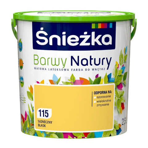 Farba lateksowa Barwy Natury słoneczny blask 115 2,5 l Śnieżka jest przeznaczona do dekoracyjno-ochronnego malowania ścian i sufitów z zapraw cementowych, cementowo-wapiennych, gipsowych, cegły, płyt gipsowo-kartonowych, powierzchni drewnianych i drewnopochodnych, a także tapet z włókna szklanego użytkowanych wewnątrz pomieszczeń. Produkt zapewnia matowe wykończenie, wysoki poziom krycia i jest niezwykle łatwy w czyszczeniu dzięki lateksowej formule.