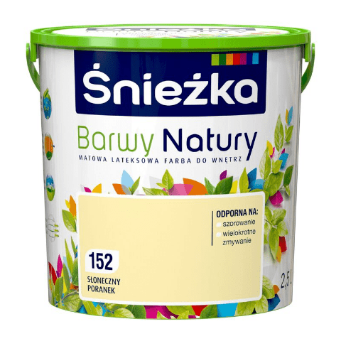 Farba lateksowa Barwy Natury słoneczny poranek 152 2,5 l Śnieżka jest przeznaczona do dekoracyjno-ochronnego malowania ścian i sufitów z zapraw cementowych, cementowo-wapiennych, gipsowych, cegły, płyt gipsowo-kartonowych, powierzchni drewnianych i drewnopochodnych, a także tapet z włókna szklanego użytkowanych wewnątrz pomieszczeń. Produkt zapewnia matowe wykończenie, wysoki poziom krycia i jest niezwykle łatwy w czyszczeniu dzięki lateksowej formule.