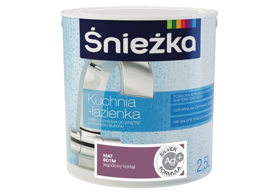 Śnieżka Kuchnia Łazienka - Farba lateksowa do wnętrz z dodatkiem silikonu: zawiera czyste srebro; powłoka chroniona przed rozwojem bakterii i grzybów; optymalizuje higienę powietrza w pomieszczeniu; odporna na zmywanie i szorowanie; nie chlapie podczas malowania; zwiększona odporność na wilgoć