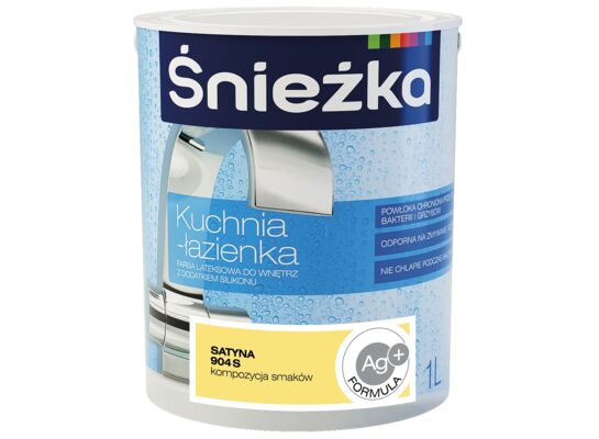 Śnieżka Kuchnia Łazienka - Farba lateksowa do wnętrz z dodatkiem silikonu: zawiera czyste srebro; powłoka chroniona przed rozwojem bakterii i grzybów; optymalizuje higienę powietrza w pomieszczeniu; odporna na zmywanie i szorowanie; nie chlapie podczas malowania; zwiększona odporność na wilgoć