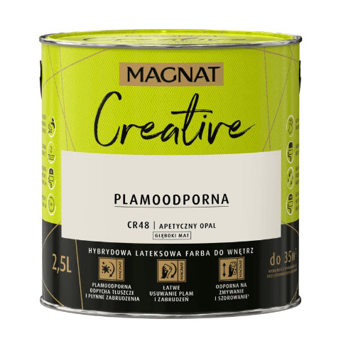 Farba lateksowa MAGNAT Creative apetyczny opal 2,5 l jest przeznaczona do malowania ścian i sufitów, m.in. z zapraw cementowych, gipsowych, cegły, płyt drewnianych oraz pokrytych tapetą. Produkt zapewnia wysoki poziom krycia, dzięki czemu pożądany efekt uzyskasz już po nałożeniu 1-2 warstw. Produkt jest odporny na szorowanie, a właściwości antystatyczne sprawiają, że farba jest przyjazna alergikom.
