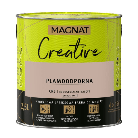 Farba lateksowa MAGNAT Creative industrialny kalcyt 2,5 l jest przeznaczona do malowania ścian i sufitów, m.in. z zapraw cementowych, gipsowych, cegły, płyt drewnianych oraz pokrytych tapetą. Produkt zapewnia wysoki poziom krycia, dzięki czemu pożądany efekt uzyskasz już po nałożeniu 1-2 warstw. Produkt jest odporny na szorowanie, a właściwości antystatyczne sprawiają, że farba jest przyjazna alergikom.